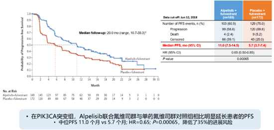 具体而言,国际多中心随机双盲III期临床研究SOLAR-1的结果显示,阿培利司联合氟维司群方案可以显著改善HR+/HER2-、携带PIK3CA突变、内分泌治疗后疾病进展的晚期或转移性乳腺癌患者的预后。相比单独使用氟维司群,阿培利司联合氟维司群治疗将无进展生存期显着延长一倍(11.0 vs 5.7个月),疾病进展或死亡风险显着降低35%,总缓解率(ORR)提高一倍多(36 vs 16%)。